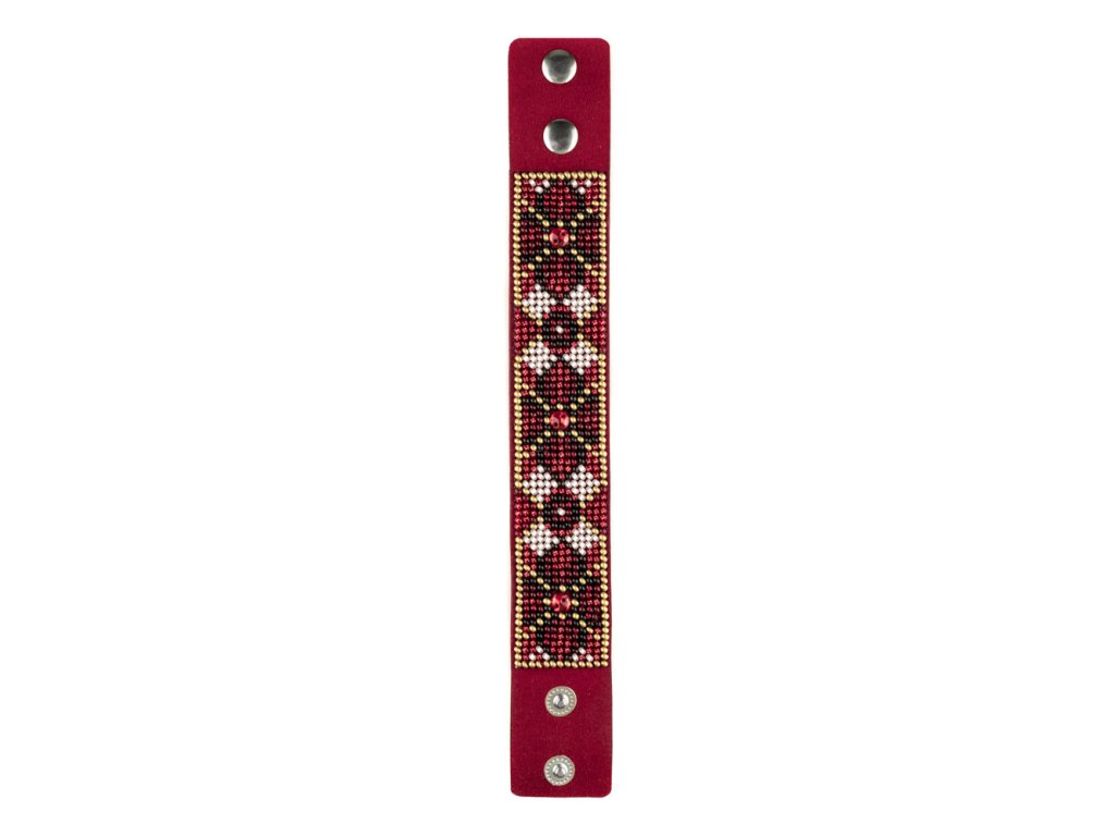 Sada pro ruční výrobu náramku. Korálková výšivka na umělé kůži, rozměr 3×22 cm. Vše potřebné pro výrobu náramku včetně perforovaného podkladu, korálků, jehly, niti a návodu.