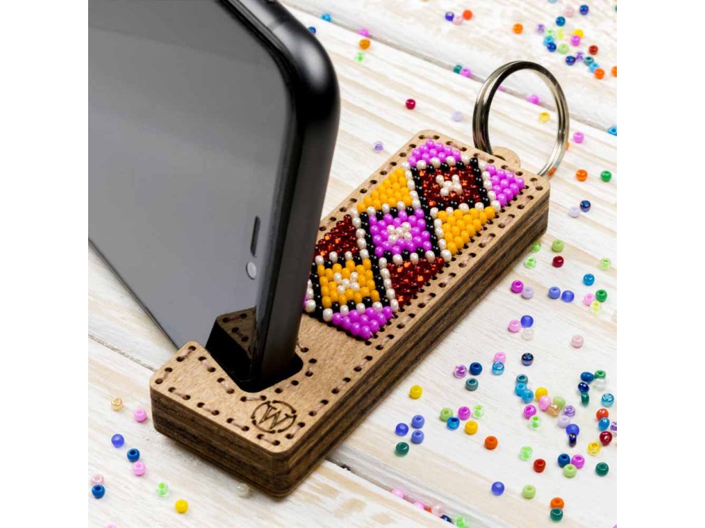 Vyšívací sada s korálky na dřevě pro tvorbu praktického a dekorativního stojánku na telefon. Hotový výrobek spojuje krásu ruční práce s funkčností a zútulní každý prostor.